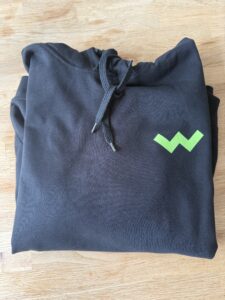 Een toffe zwarte hoodie met aan de achterkant de coordinaten van het Westland en aan de voorkant een groene W uiteraard is het Westlandsgroen.